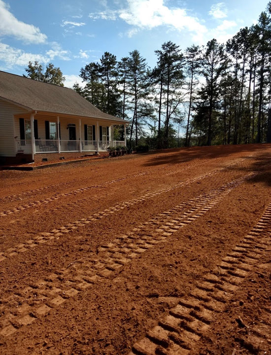 This project features the development of land and grading services, including freshly graded land beside a house, surrounded by trees, and cleared land with sparse trees and cloudy sky. The images showcase the transformation of the land and the grading process.